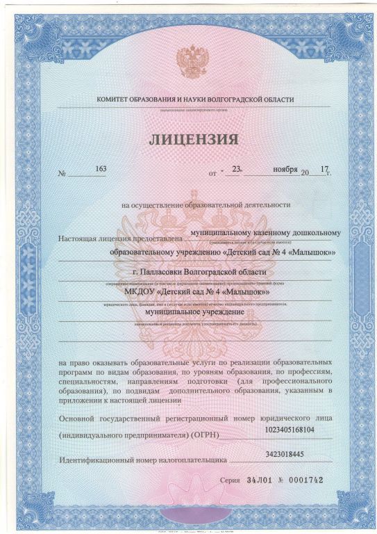 | Полное наименование образовательной организации* | Муниципальное казенное дошкольное образовательное учреждение «Детский сад № 4 «Малышок»» г.Палласовки Волгоградской области |